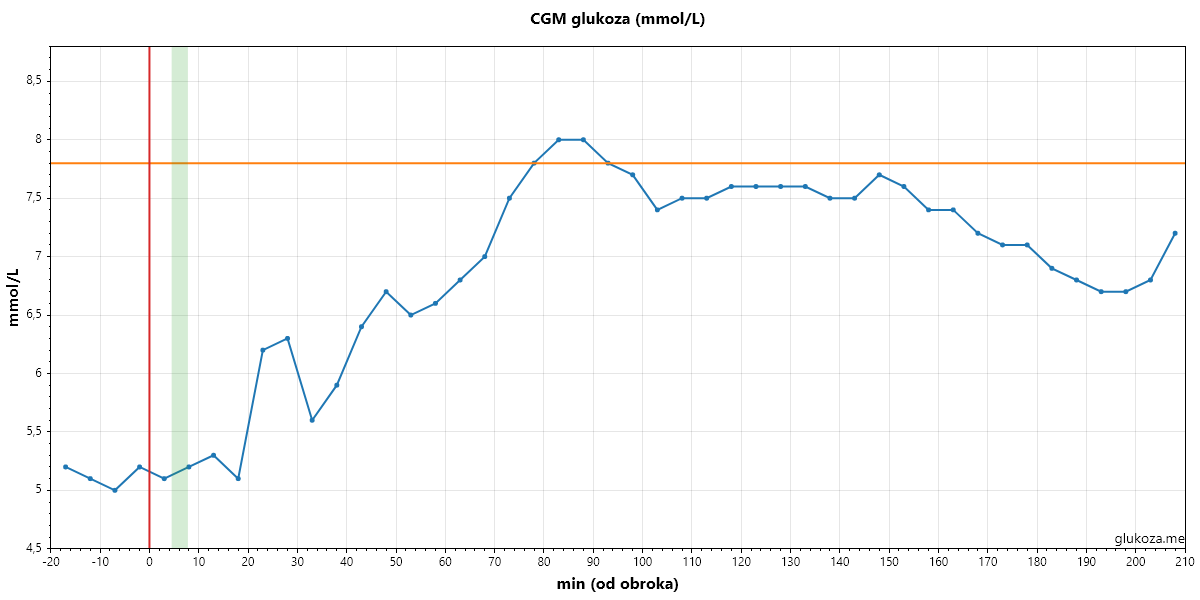 Na grafiku se vidi jasan i izražen porast glukoze, sa vrhom oko 8.0 mmol/L, koji se javlja otprilike 80 minuta nakon obroka. Ono što je posebno važno nije samo sam maksimum, već činjenica da je glukoza povišena duži period, što ukazuje na visok glikemijski stres.